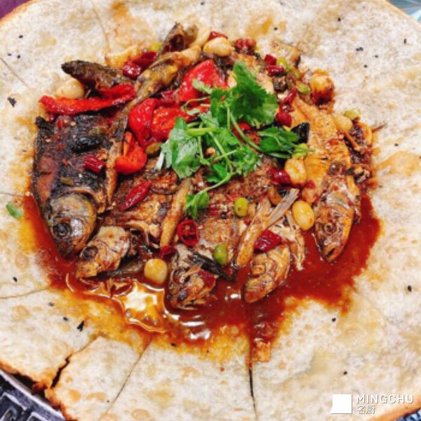 杂鱼家家都会烧但是配上这个饼就不一样了 可以说饼比鱼好吃 也是店里的一个招牌菜 根据季节搭配不同鱼的品种 也可以搭配虾子 龙虾 螃蟹 最高峰一天卖130份