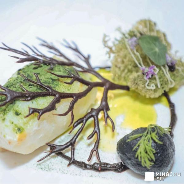 低温鳕鱼/黑蒜泥/驯鹿苔藓/黑松露肉球