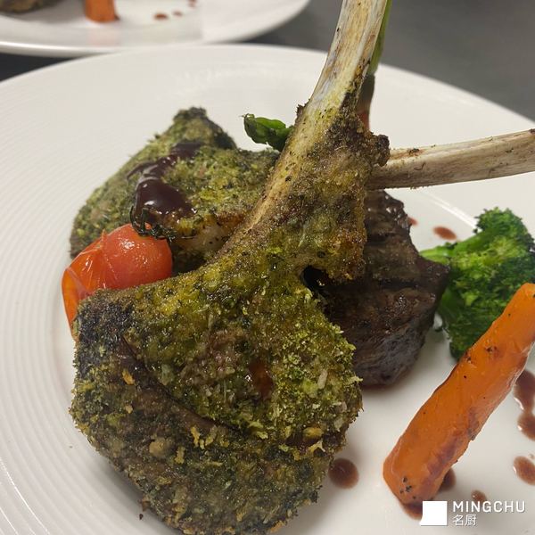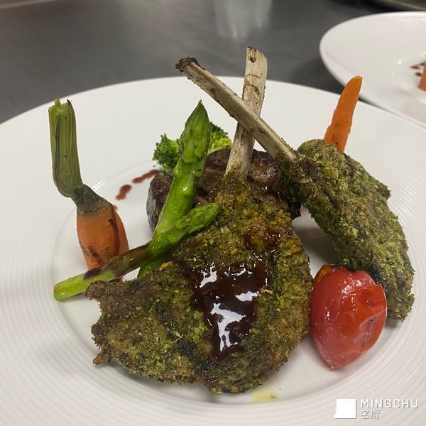 香草中低温烘干,将羊排在趴条上煎至轮胎条纹,摸上黄油粘迷迭香草碎,烤箱升温至175度烤至10分钟。主料:法式羊排两块。 配料:手指萝卜、西兰花、小番茄。酱汁:法式红酒汁。