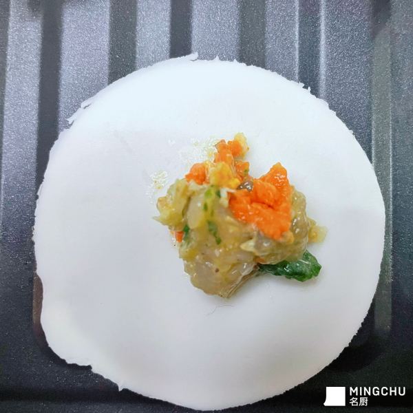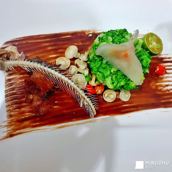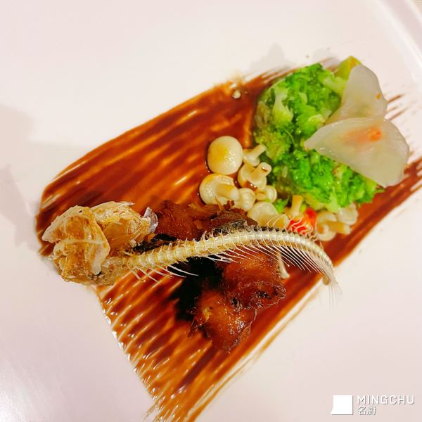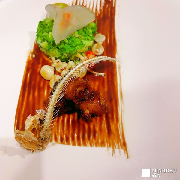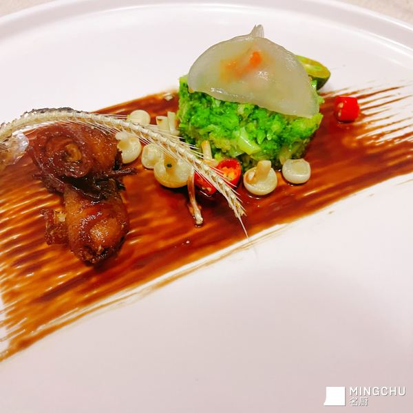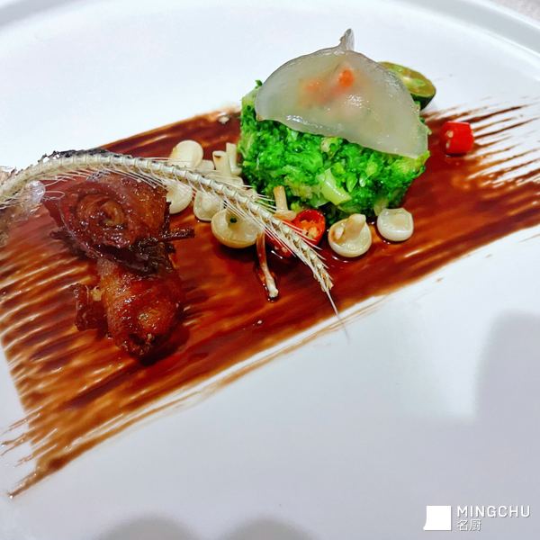 椒盐刀鱼骨配黑醋汁刀鱼卷佐西兰花塔塔及蟹黄水晶刀鱼饺子