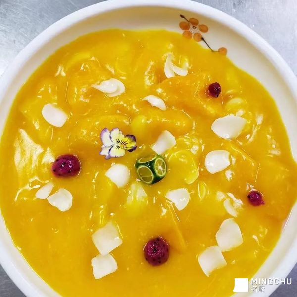 黄桃芝士南瓜是小孩,年轻女士的喜爱,南瓜奶香微甜和黄桃百合水果的青脆,美容养颜的一道奶香甜菜品,营养价值高。