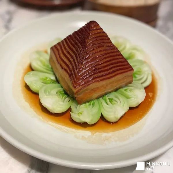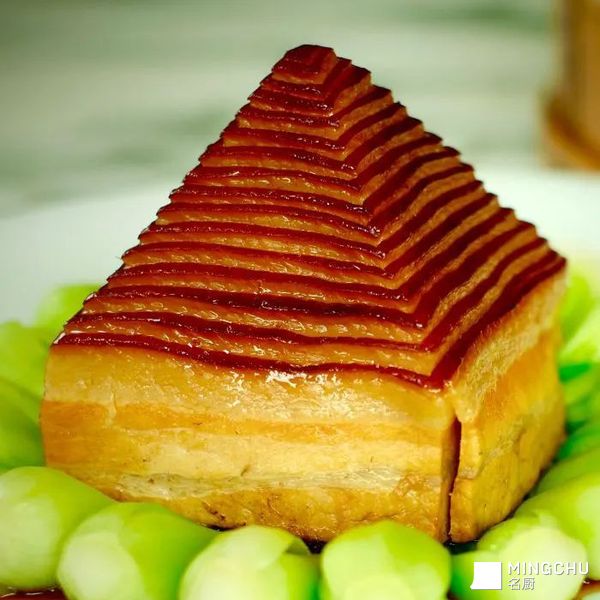 宝塔肉造型别致、色泽油润、香气浓郁,外形似金字塔,经过煮、焖、煎、蒸,五花肉油而不腻、酥而不烂, 梅干菜香气扑鼻、清香爽口,不愧为一道既饱口福,又饱眼福的美味佳肴,过年摆上餐桌招待亲朋,特有面子;2、煮熟的五花肉用滚刀法切成片,放入碗中,放上芽菜,淋上老酱汤,入蒸笼蒸2小时;3、肉扣在盘中,用西兰花围边,原汁用生粉勾芡,淋在盘中,与荷叶饼一同上桌即可。