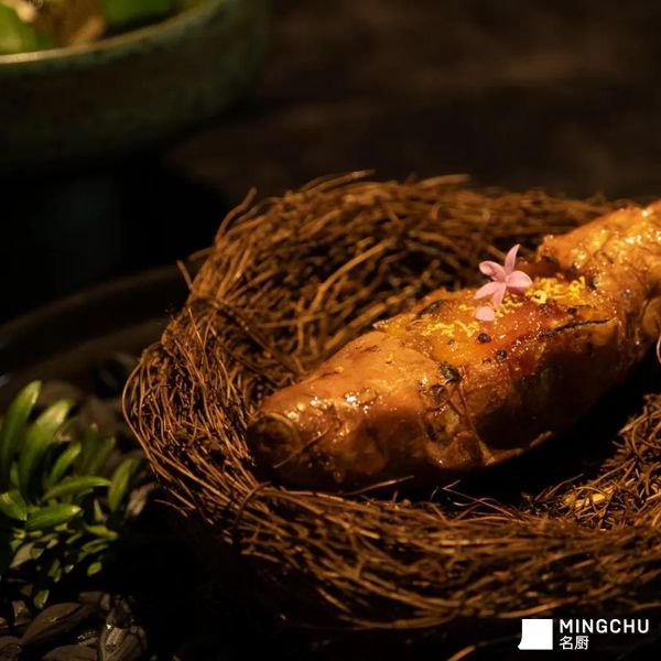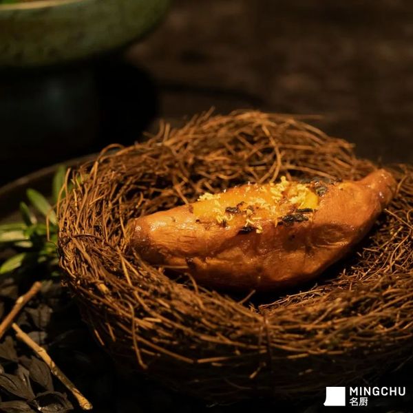 烤红薯,可能是会唤醒许多人童年记忆的一种食物。在冬天看到它,也许不经意间会想起,村里土灶台下,一堆散着余热的柴火里,溢出来的甜蜜焦香味。 我把它当做一道冬季里的特殊头盘,客人从寒冷室外,哈着冷气走进餐厅坐下。先送上一小杯热腾腾的炒米奶茶,接着端来的是流着蜜油,散发着焦糖香气的蜜薯。 红薯不做过多处理,食材选择无渣且干湿度适中的黄金蜜薯,用最简单的烹饪方法。把温度时间给够,火候到了,红薯外层会有红薯干一样的韧性内里还是湿润有汁水的。