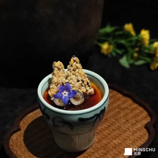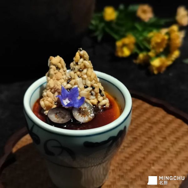 平时很喜欢吃,自己家附近的台州点心小馆子,扁食麦饼真的是最爱。冬天的时候一晚姜汁调蛋几乎是桌桌必点,被烧成蜂窝状的蛋装在烧的黑乎乎的不锈钢马兜里,看着相貌平平,可一入口蛋香,红糖的香甜,坚果的油脂感被一丝丝姜的辛辣平衡的恰到好处。冬天吃的确是暖胃过瘾,只是被烧出孔洞的蛋液吃起来让人觉得糙口的很,实在是有点可惜。 想着就用法式炖蛋的方法来细腻口感,至于脆片就用自己从小喜欢吃的零嘴——冻米糖的搭配来做。这样一来米香,坚果,红糖,姜汁层层递进,味道更为丰富些。