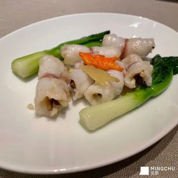 生炒星斑卷,东星斑鱼片卷入糖火腿、笋丝、香菇丝和潮州酸菜一起过嫩油快炒,口感紧实弹嫩。