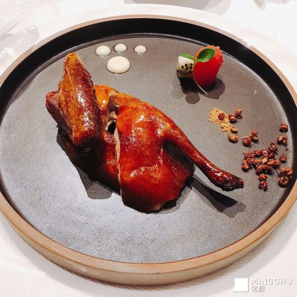 自制调料腌制乳鸽 3 小时时间,去除乳鸽本身淡腥味后,加入汉源的 青花椒与红花椒腌制 4 小时进行入味。入味后码料风干 3 小时时间,再进 行烤制,最后用 150°的热油进行上色。一只乳鸽, 至少需要十小时以上时 间的入味准备。希望让客人感受到乳鸽的外酥里嫩的肉质之外, 还能感受 到丰富香料味道味为舌尖带来的强烈味觉记忆 。
