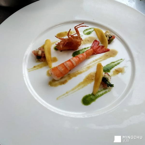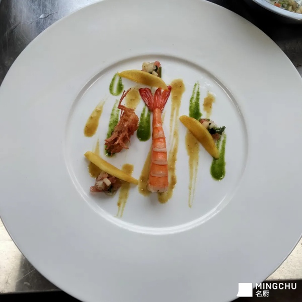 黄油煎明虾/天妇罗炸虾头配墨西哥沙沙酱佐咖喱腌苹果和印尼风味海鲜汁