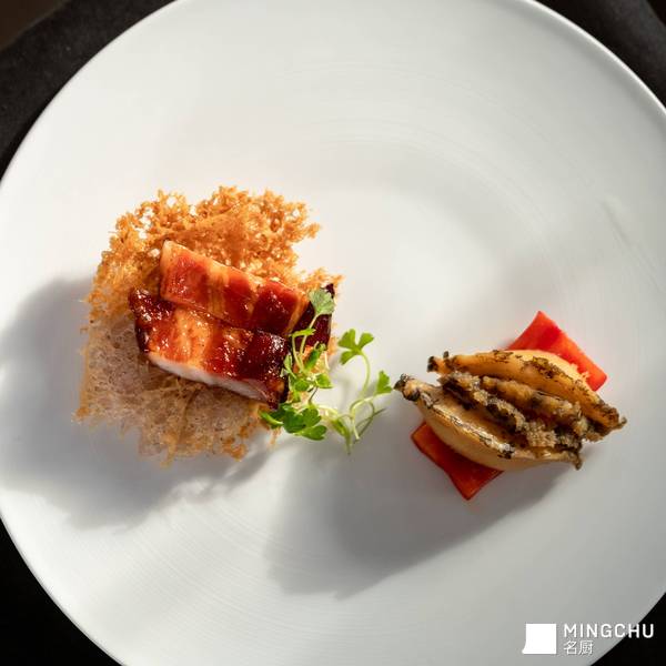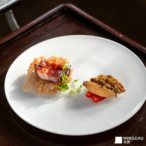 选用欧洲爱尔兰猪梅肉,以增加了蓝莓汁的叉烧酱腌制后烤制而成,搭配鲜甜微辣的海鲜,以及由扬州传统糖醋汁衍变而来的糖醋桂花汁,入口酥香,酸甜盈口。