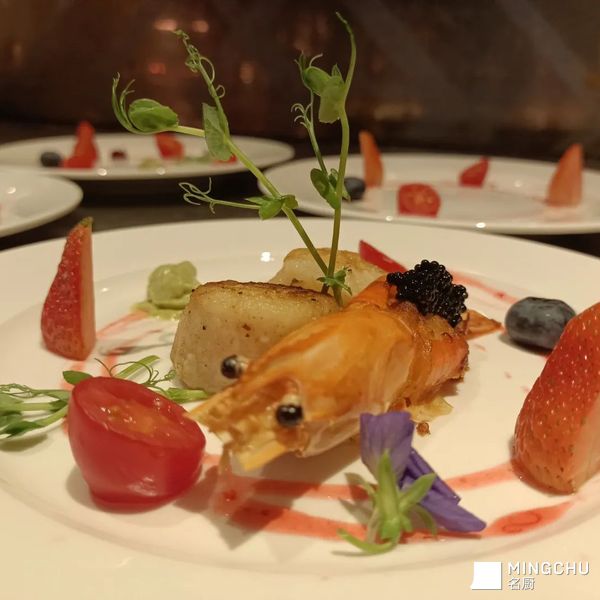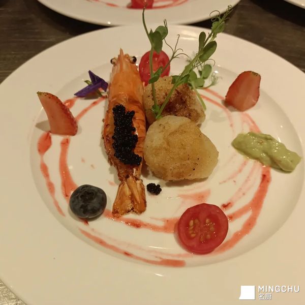 大头虾配日本带子草莓汁牛油果酱鲜果鱼子酱