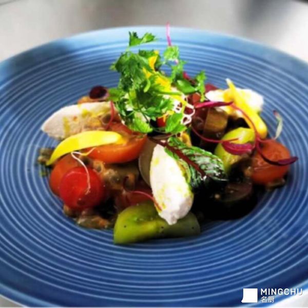 灵感来源于意大利的番茄水牛芝士,番茄选择了混合番茄,不同品种的番茄会带来各种不一样的口感,用自制的轻芝士感觉会更适合中国人的饮食习惯。罗勒酱换成了更容易为人接受的百香果,可是为了尊重传统做法,保留了罗勒油的点缀