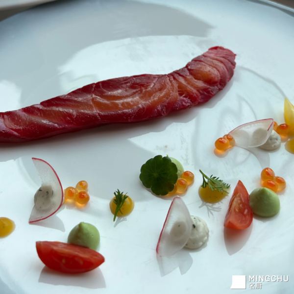 一道非常经典的北欧菜品,红菜头汁腌制出来的三文鱼颜色非常漂亮。