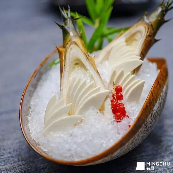 冰镇云岭笋成为夏日新宠,因为夏季炎热,所以创新了这种竹笋的吃法,可以在炎炎夏日感受到竹笋带来的冰爽感觉,这道菜的做法很简单,只需将新鲜竹笋去壳后取较为嫩的笋芯部分,水煮去苦涩,再入上汤中浸煮至笋吸入汤鲜味。再将煮好的笋取出放凉后切薄片摆入冰盘中,爽脆无比,鲜嫩而无渣。吃的时候可佐以酱油芥末或家乐豉油汁,这种清爽的口感就是夏日里的小清新。