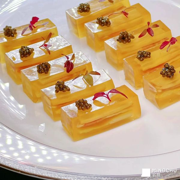 诺邓火腿闻名全国,诺邓火腿之所以好吃,是因为腌制火腿的盐巴。那盐是从村里一口千年盐井里来的。现在,很多人专门到诺邓,就为了尝一尝传说中的火腿。诺邓火腿搭配鸡枞菌用高汤喂制,好了之后加入鱼骨粉烧开,放入磨具内,冷却拿出装盘,点缀鱼子酱即可。