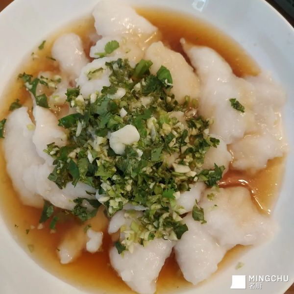 鱼上放蒸鱼豉汁,大蒜香菜碎。