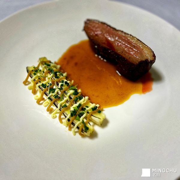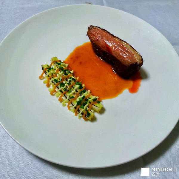 鸭胸借鉴粤菜脆皮鸡的做法,烫皮-多次上皮水-风干-最后油淋,这么做一是能够干化外壳,从而最大化保留鸭胸内部汁水,二是鸭皮在高温油淋后,能够呈现类似北京烤鸭的风味效果,酥而不腻。酱汁店制作融入了闽南特色菜-姜母鸭的手法,增加了鸭肉的风味层次配菜-京葱的设计是为了缓解鸭肉和酱汁的厚重感,京葱本身的鲜甜和栗子泥的焦糖风味相互映衬