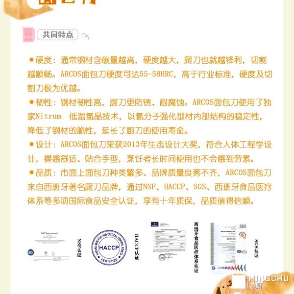 ·品质:市面上面包刀种类繁多、品牌质量良莠不齐,ARCOS面包刀来自西班牙著名厨刀品牌,通过NSF、HACCP、SGS、西班牙食品医疗体系等多项国际食品安全认证,享有十年质保,品质值得信赖。