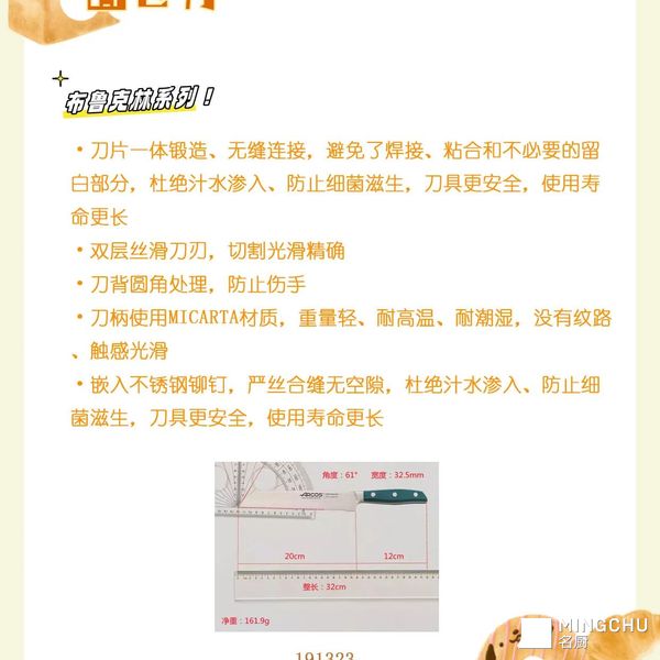 ·韧性:钢材韧性高,厨刀更防锈、耐腐蚀。ARCOS面包刀使用了独家Nitrum®低温氮晶技术,以氮分子强化型材内部结构的稳定性,降低了钢材的脆性,延长了厨刀的使用寿命。