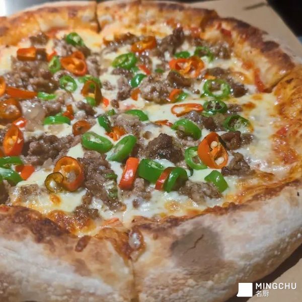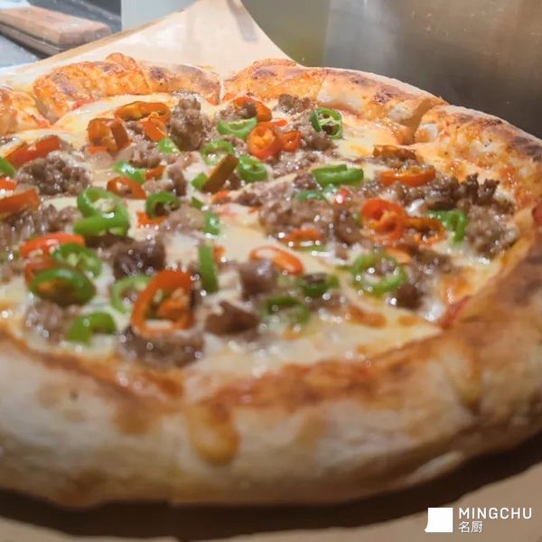 意大利拿坡里披萨饼底,羊肉是中东的香料做法,选用青杭椒,美人椒,一个多元化的组合