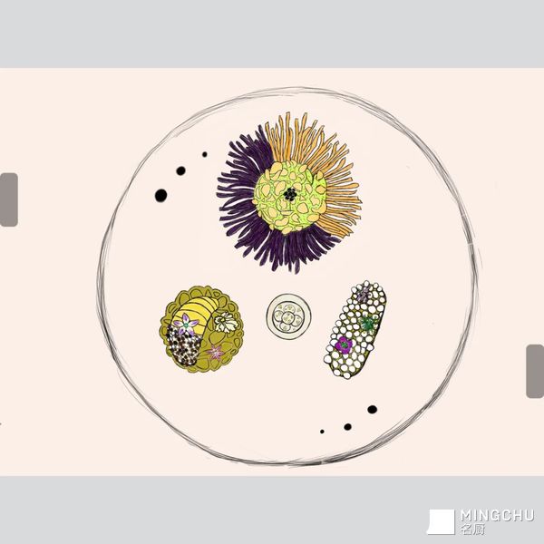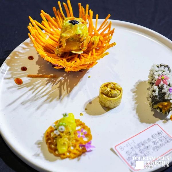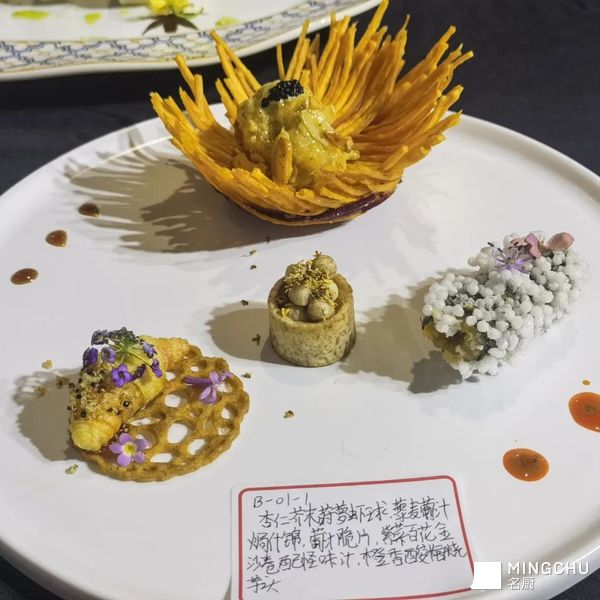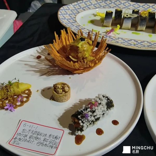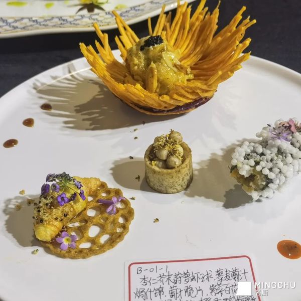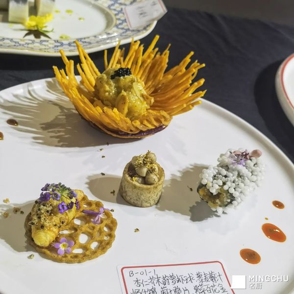 我的这道作品运用了大量中餐味道与西餐元素进行了融合,比如芥末虾加入了莳萝,还用了西餐中鱼肉慕斯来增加工艺性与味道的层次感,还有用风干西米来代替脆皮糊来为食材增加口感,我做这道菜品的寓意就是让希望我们的菜品在保持原有的味道与传统的基础上,增加或改变一些过程,来对菜品进行不断的创新与融合,为我们带来不同的搭配与新意