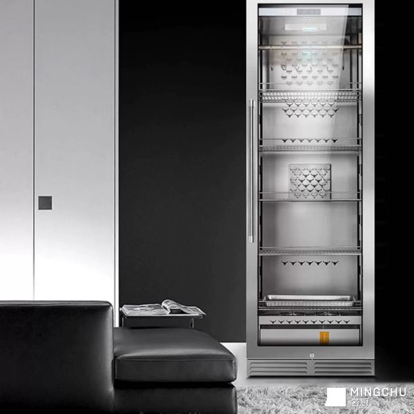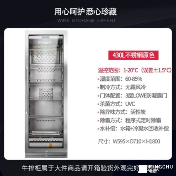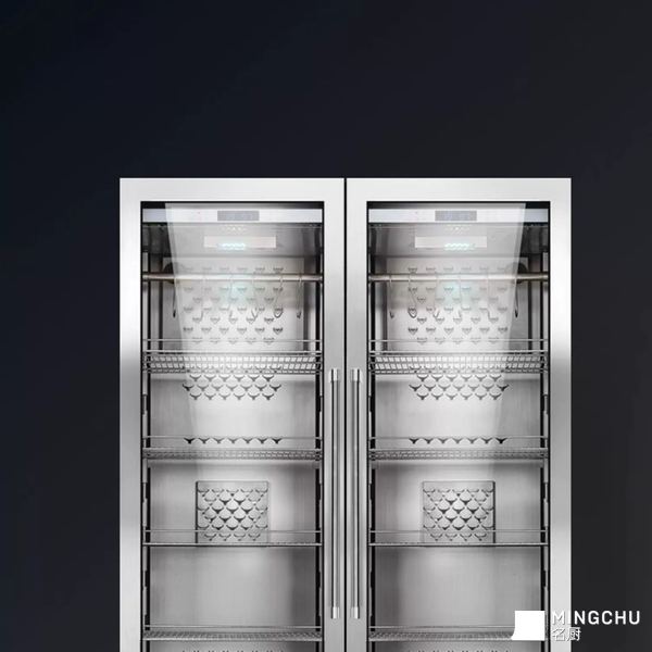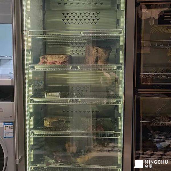 干式熟成:传统做法是将屠宰的牛羊整体或切割后的大块肉不加任何包装悬挂于恒温恒湿、无菌的干式熟成柜中。