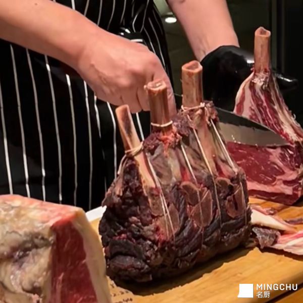 这个手法是以肉汁的损耗来换取风味,所以最忌讳煎过熟,最好是煎到三分熟,才不会吃起来又干又柴。肉眼(Ribeye)、西冷(Striploin)和臀肉(Top-side)是三个最适合干式熟成的部位。#VERY干式熟成柜