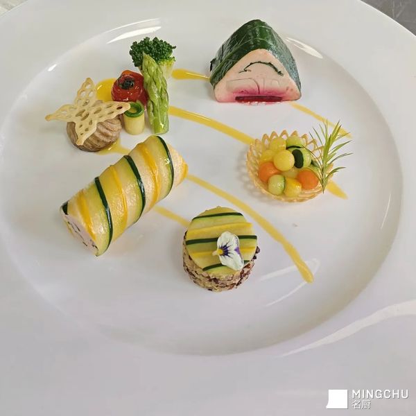 虾肉慕斯 双色节瓜卷 脆盏炒蔬菜球 三色藜麦 时蔬 鲜橙少司