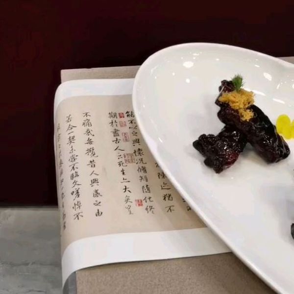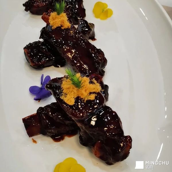 #烤黑糖老手艺在粤菜叉烧技法当中潮汕客家人非常注重老手艺制作工艺和非遗传承💯#这道菜选用黑猪肉排它的烹任技法采用盐水五香白卤煮15分钟然后寖泡入味放凉拍粉5成油温炸一下↓然后用自制黑糖叉烧龟苓膏挂汁出锅装盘🔥
