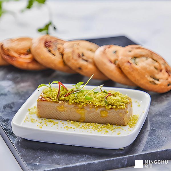西式菜品和中式点心的融合, 香脆焦糖,丝滑鹅肝, 坚果清香。都赋予在葱香浓郁, 外脆里嫩的饼上了。