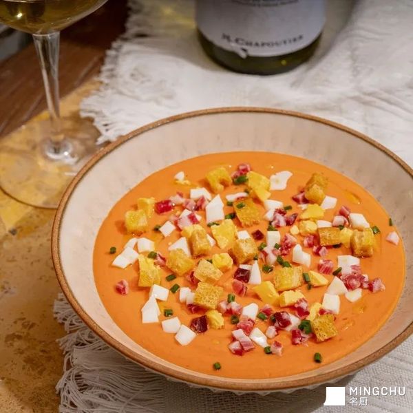 西班牙番茄冷汤(Gazpacho)是一道传统的西班牙凉菜,尤其在西班牙南部地区非常流行。它通常作为开胃前菜,清凉爽口,适合夏季食用。