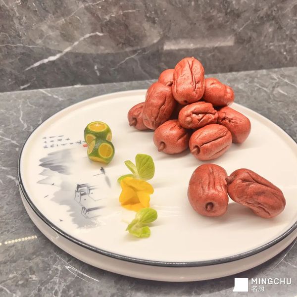 - 步骤:将酵母、绵白糖、可可粉、红曲粉倒入盆中,加入红菜头汁搅拌均匀,再倒入中筋粉、泡打粉,先搅成面絮,再揉成面团。把面团放入压面机反复压30遍以上,放进塑料袋醒发10分钟。将醒发好的面团压成面片,卷起搓匀后下20克左右的剂子。把剂子拍扁,包入5克枣泥馅,封紧口部,搓成椭圆形。用锡纸包裹生坯塑出纹路,放入模具,用面塑工具在一头戳洞,粘上黑芝麻,醒发10分钟后上锅蒸10分钟。