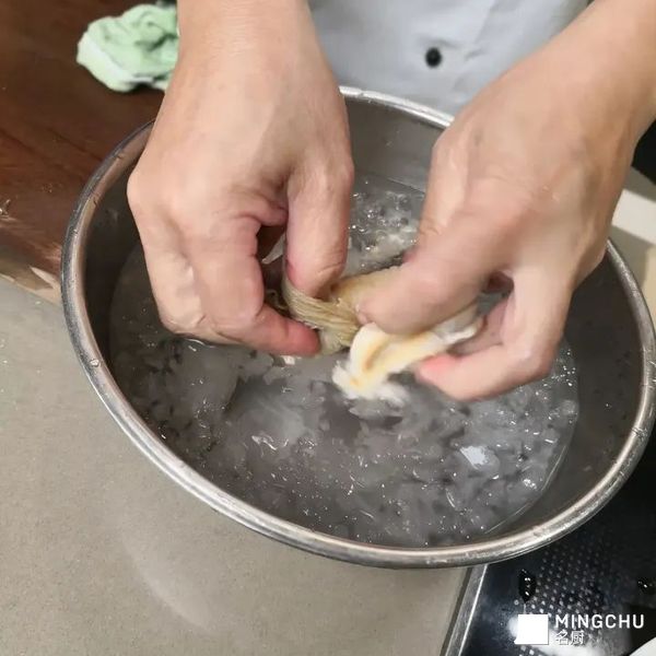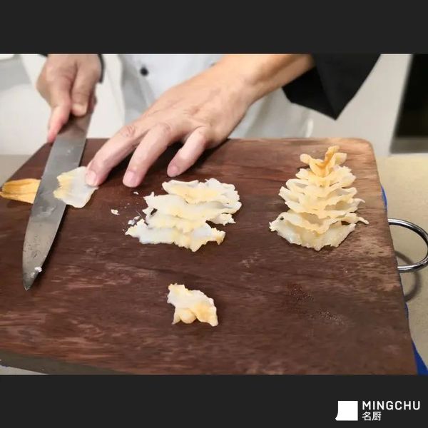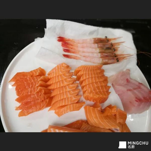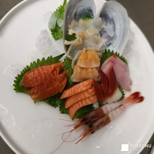 处理好的象拨放冰水,切好的三文鱼等,切象拨切薄片,摆盘