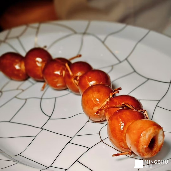 选用30年老菜脯与5年新菜脯,30年老菜脯经过长时间发酵,陈香味浓郁;5年新菜脯味道较直接,增加内馅层次感。搭配许榕溏心干鲍,此种干鲍被誉为鲍鱼中的“劳斯莱斯”,光照肉心部分会呈现透光的橘红,口感软糯,富有胶质感。经过长时间烹饪后,鲍鱼的鲜味充分释放,味道浓郁醇厚。精选饶平黑猪大肠,选用黑猪大肠中段,处理干净后薄而脆。选用广东揭阳鲜笋,春季鲜笋,口感脆嫩。使用被誉为“广东三宝”的糯米禾杆草绑扎大肠,增加韧性。最后蘸料使用自制梅羔酱,酸甜解腻。