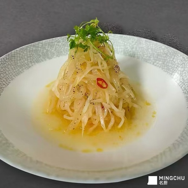 将爽脆的酸萝卜与口感独特的海蜇丝相融合,酸萝卜的酸甜开胃,能很好地激发食欲,海蜇丝则口感爽脆,富有嚼劲。