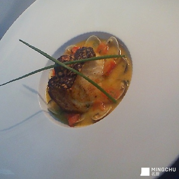 鳕鱼配蛤蜊,藏红花番茄汁