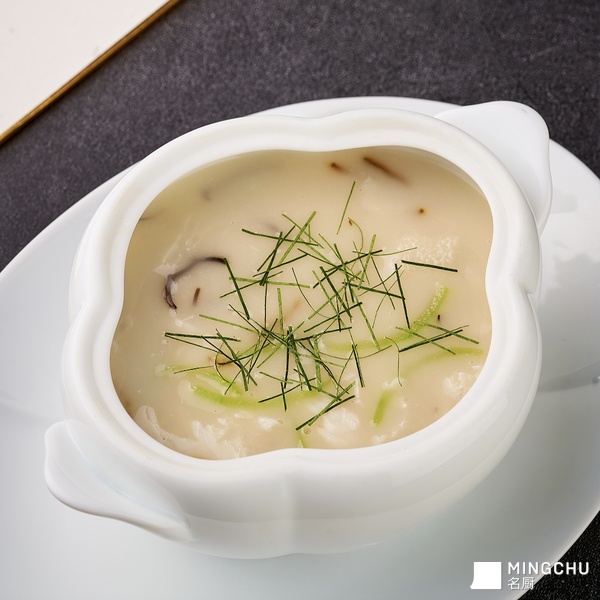 【创意来源】拆鱼羹是广东传统顺德名菜,顺德人对吃鱼的讲究出神入化,一鱼四味其中就有拆鱼羹,鱼煎汤讲究新鲜和火候,我的父亲是顺德人,传授做鱼汤有别其他人,口感丝滑绵绸带有轻轻米香和白菜清甜,辅料除了姜丝陈皮丝和手拆新鲜鱼肉,云南竹笙和兰州百合,还有花胶和干贝丝,增加海洋气味,最后点缀柠檬叶丝和榄仁是这道顺德经典鱼羹的灵魂。【风味特点】鱼汤细腻鲜甜,温润绵绵,清鲜滋香,口感层次分明。鱼汤的鲜甜,陈皮的陈香,花胶的软糯,柠檬叶的清新,极具分明和层次的味型,结合得相得益彰。