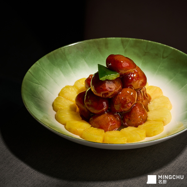 将猪肉用盐、淀粉和蛋白浆腌制入味,锁住水分,用150度油温炸至外酥里嫩。凤梨加入糖浆腌制,还原了传统菠萝罐头的香甜,使得凤梨鲜甜的同时多了一丝微微的清香。