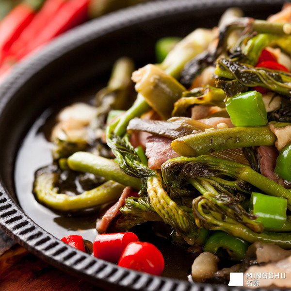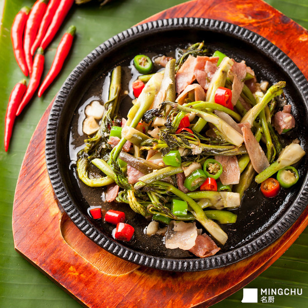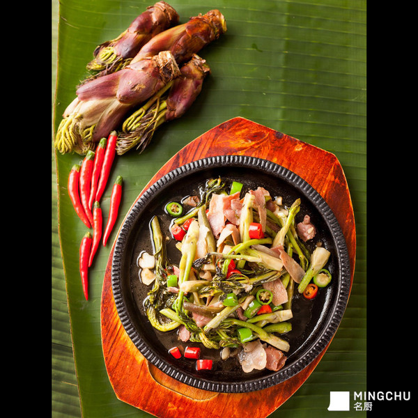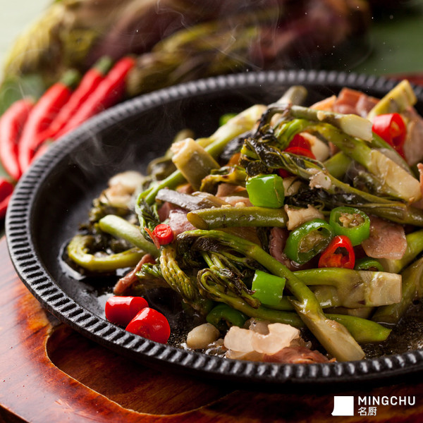 将树头菜去掉外层的老叶,技巧是焯水时放入加了盐和色拉油的冷水,水沸后捞出即可。这样炒出的菜不会失去鲜艳的光泽。焯水时树头菜已有六成熟,只需再次大火快炒即可。菜品总用时不要超过1分钟。
