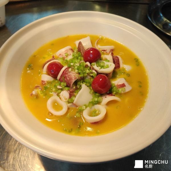 主料:小管(340克) 辅料:莴笋(250克)绣球菌(12O克)红灯笼椒香芹碎15克酱料:黄灯笼辣椒酱少许,蒜末少许,白醋少许。将小管飞水后过冰,然后将莴笋和绣球菌飞水后垫底,然后放入酱料炒香后加入高汤,煮至两分钟即可装盘