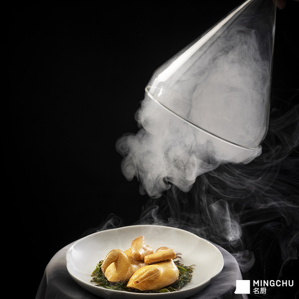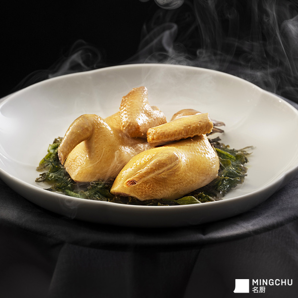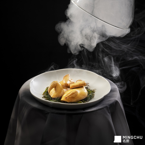 【创作灵感】根据安徽无为板鸭的特点,以乳鸽为主料,改良制作而成。茶熏乳鸽的制作过程较为复杂,关键在于选材和工艺。【甄选食材】乳鸽选用生长期为 22 天的雏鸽,净重在 300 克左右为佳。乳鸽富含蛋白质和微量元素,经过烹调,营养与美味兼备,非常适合作为宴席上的佳肴。【菜品特点】乳鸽经过泡好的茶叶、桂花、小米、白糖的熏制,以及使用多种调料与香料自制卤汤,浸泡入味,出品色泽金黄油亮,皮脂丰润滑爽,肉质鲜嫩富有弹性,醇香味美。