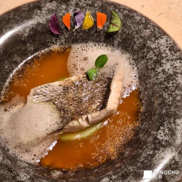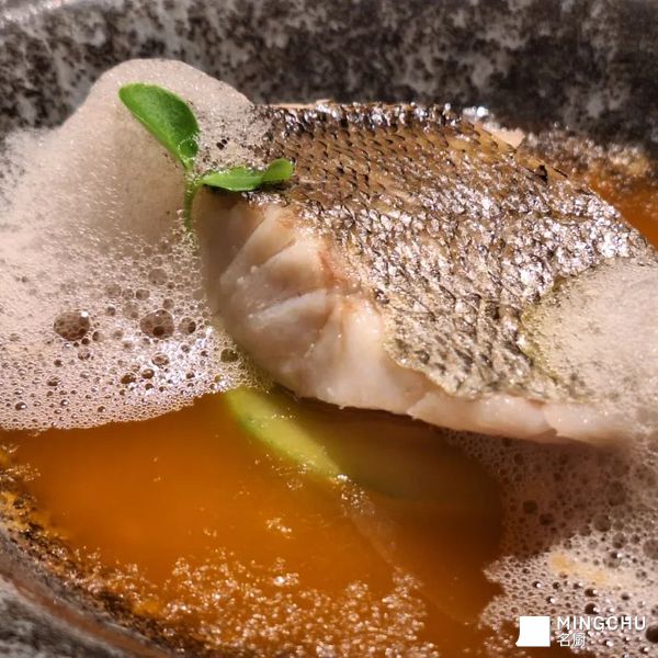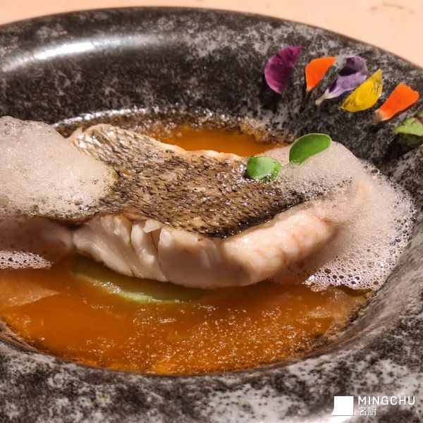 将整条黄鱼分割背部开刀取肉备用,鱼骨头备用将白虾开背取虾线备用,手指胡萝卜去皮备用,白虾和鱼骨头放到油锅中炸制金黄,用锤子敲碎再次下锅中炒制,加入热水煮制金黄颜色过滤留虾汤调味备用。味增1:2的水加味淋调味,加大豆卵磷脂迅速打起泡沫备用。黄鱼肉用海盐清酒腌制5分钟,吸干水分用80度油濅煮8分钟捞出,准备装盘出餐,手指胡罗卜和黄绿节瓜切小丁,蜜豆一起炖煮调味垫底,黄鱼放节瓜上边,味增泡沫淋旁边,蜜豆摆盘,加入虾汤到底部,整体的菜品才算完成,运用多种中日式技法,分子料理。