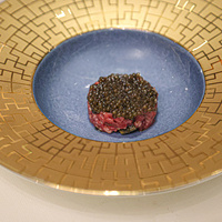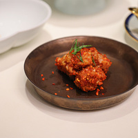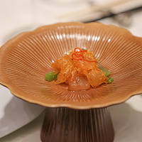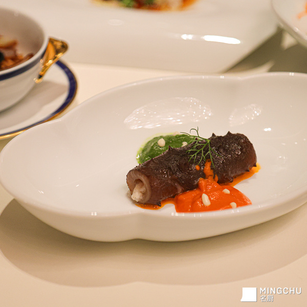 王业陆主厨客座天宝中餐厅菜品,以鲜虾茸填充海参,清蒸保留柔嫩口感,搭配葱油与红椒双酱,并点缀韩式蒜蓉泥,层次丰富。