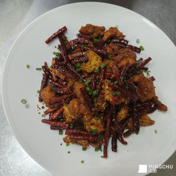 1.鸡去骨,腌制底味,蛋白浆挂糊,炸,鲍鱼改刀,底味干生粉抓一下。锅中底油下青花椒5g,花椒油10g一起下丘比辣椒100g炒香下炸好的鸡和鲍鱼,出锅前6g丘北辣椒末,5g花椒末,花生,4g味4g鸡,葱花出锅