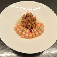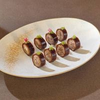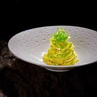花枝卷为主要原料,经处理后卷制而成,搭配青笋等蔬菜丝增加口感层次。蒜香浓郁,红油赋予其艳丽色泽与香辣口感,花枝卷本身脆嫩弹牙,在红油蒜汁的包裹下,鲜香与麻辣交融,口味丰富且极具冲击力。盛放在带有花纹的精致瓷盘中,红亮的蒜汁衬得花枝卷洁白雅致,点缀的绿色和橙色配料更提升了视觉美感,是一道兼具颜值与口味的佳肴。