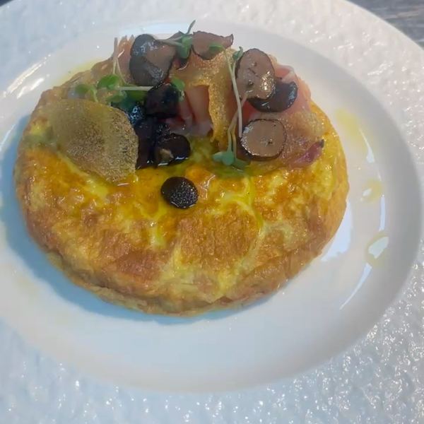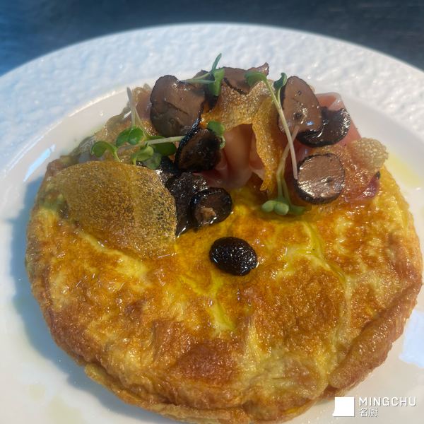鸡蛋与土豆的结合材料,黄皮土豆1个,鸡蛋3个,火腿20克.黑松露10克.蟹味菇20克,橄榄油50克,水晶苗少许1土豆去皮切成薄片,清水冲洗干净淀粉,再用冰水泡五分钟,2热锅烧油到80度再加入泡洗好的土豆薄片炸至金黄色取出3,打3个全蛋打散放少许盐再加入炸好的土豆薄片搅拌好,4.18寸不沾锅烧热放油把第三步倒入慢火煎至金黄取出,5装盘摆好火腿黑松露菌土豆脆片水晶苗装饰即可
