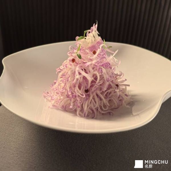 从食材呈现来看,主体是切凤尾处理得极为精细的紫菘(紫白菜),经油醋汁浸润后,色泽粉紫相间,口感爽脆。摆盘造型如凤尾般蓬松雅致,还点缀了黑醋鱼籽的调味和香菜苗,既提升了视觉层次,也丰富了味觉体验,是一道兼具颜值与风味的开胃小菜。
