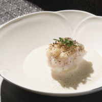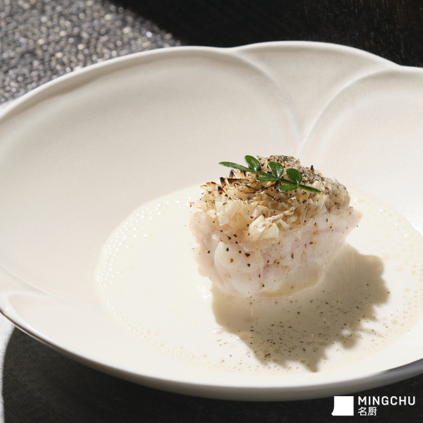 甘鲷又称马头鱼,头型方正,易于辨认,甘鲷运动量较少、生长速度缓慢,肉质细嫩、滋味鲜甜。品种依身体色泽分为金甘鲷、红甘鲷,白甘鲷等,其中以白甘鲷味道最好,肉质软滑。这道菜以“立鳞烧”的方式处理,表皮酥脆而肉质细腻。