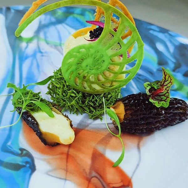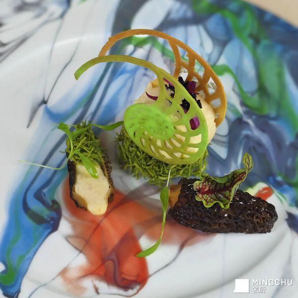 羊肚菌鲜虾慕斯.开心果面包丝.鱼籽酱.海螺脆片.蔬菜苗