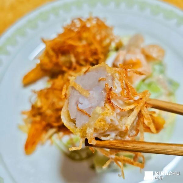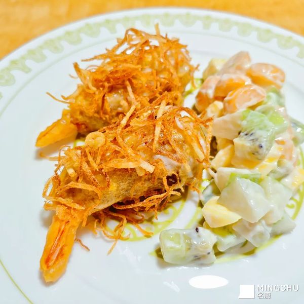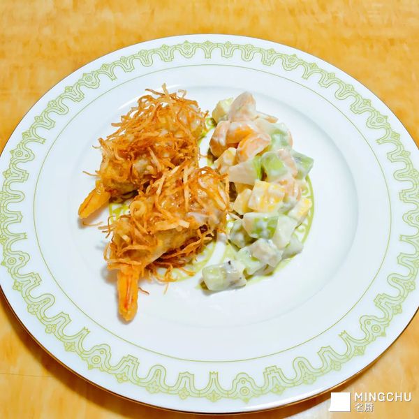 秋天,正是广西荔浦芋头上市的季节,作为古代贡品,其质地香甜粉糯,与大虾的爽脆Q弹形成鲜明对比,马铃薯炸的金丝又是酥脆的口感,配上清爽解腻的水果沙拉,让这道菜不仅好看,而且还带有丰富的口感。 #盘中经纬·味觉的诗篇 #“名厨 Art”联名艺术餐盘 #第124期试用