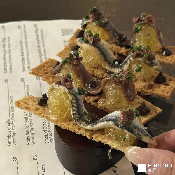 这道黑凤尾鱼脆片,是下酒的“轻量炸弹”:脆片咬开是麦香蓬松的空感,裹着油醋汁腌透的凤尾鱼——咸鲜里裹着发酵的酸香,像把海风揉进了油脂里。中间垫的蜜渍瓜肉是神来之笔,脆甜裹着晶亮的糖霜感,把鱼的咸、醋的锐都柔化了,每口都是“咸鲜→脆甜→麦香”的三重跳,攥着酒杯啃完一碟,酒都多喝了两盏。