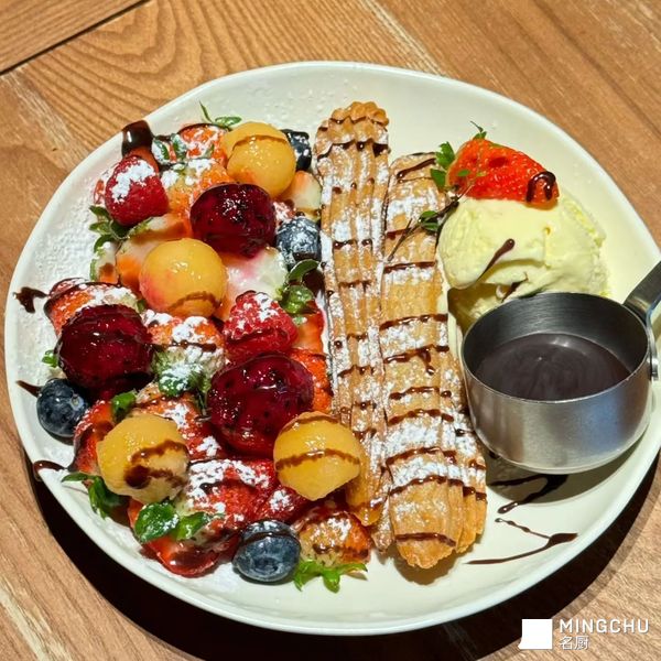 它的核心是西班牙传统小吃“吉事果(Churros)”——类似酥脆的小油条,搭配了新鲜水果(草莓、蓝莓、芒果等)、冰淇淋,还淋了巧克力酱、撒了糖粉,是很受欢迎的西式甜品~